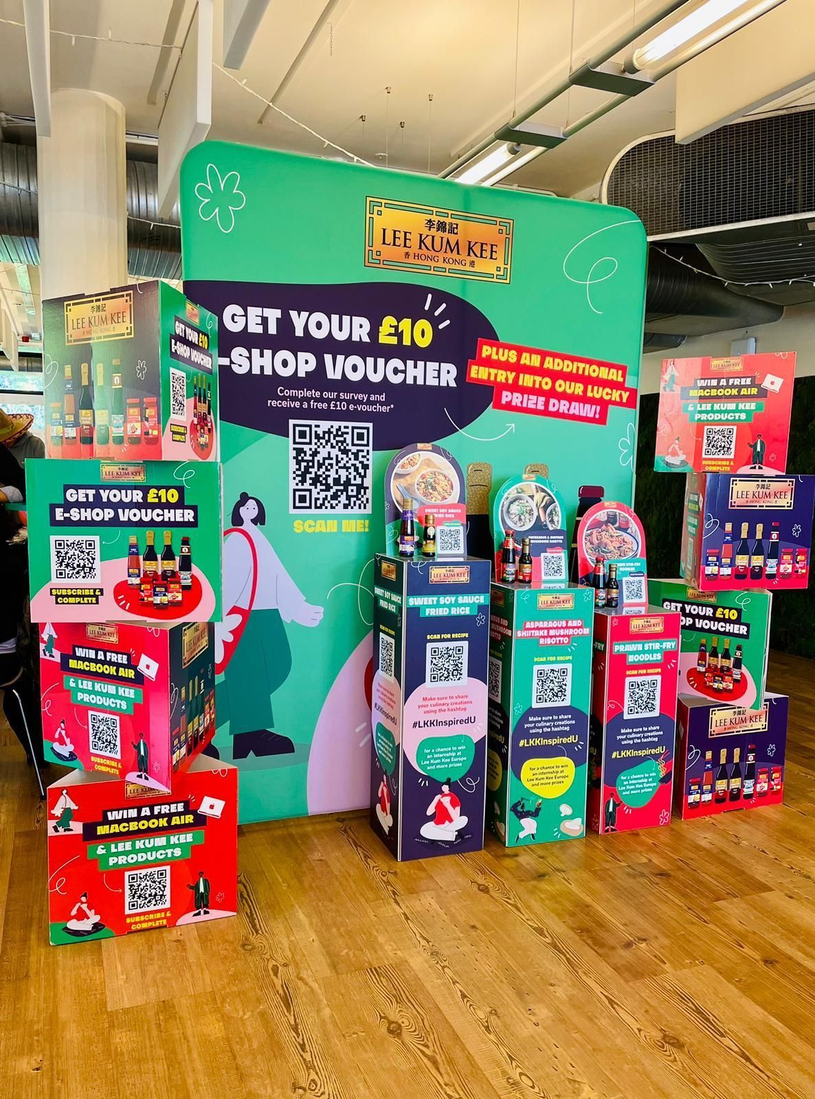 The stand consisted of large colourful backdrops and plinths housing some of the key hero products from the Lee Kum Kee range. Alongside this we displayed various recipes to help inspire students to cook up some tasty dishes for their housemates. To claim their £10 e-voucher, students simply filled out a survey via a QR code on their phones. The survey not only delivered valuable insights to student buying behaviour, but also encouraged students to opt-in to the Lee Kum Kee newsletter. The data collection element was handled entirely by the Crowd Agency.